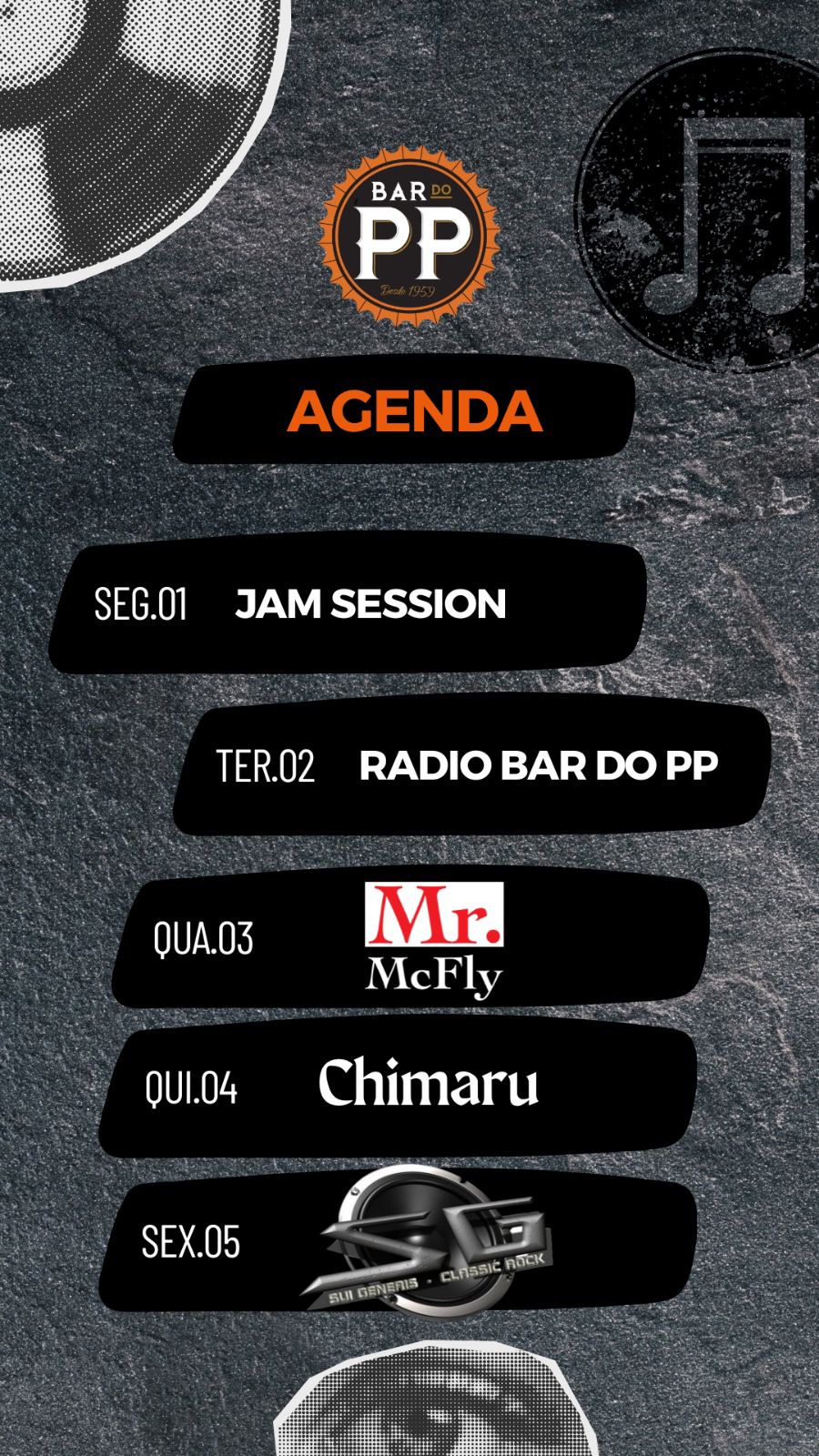 O Bar do PP inicia dezembro mantendo a tradição de ser ponto de encontro da música ao vivo em Balneário Camboriú, com clima de pub, encontros entre amigos, churrasqueiras para locação e uma agenda dedicada ao rock. Nesta semana de 1 a 5 de dezembro, o palco recebe Jam Session, programa de rádio autoral da casa e três bandas com repertórios cheios de clássicos, pop rock e flashbacks, reforçando o bar como referência entre bares e pubs da cidade.