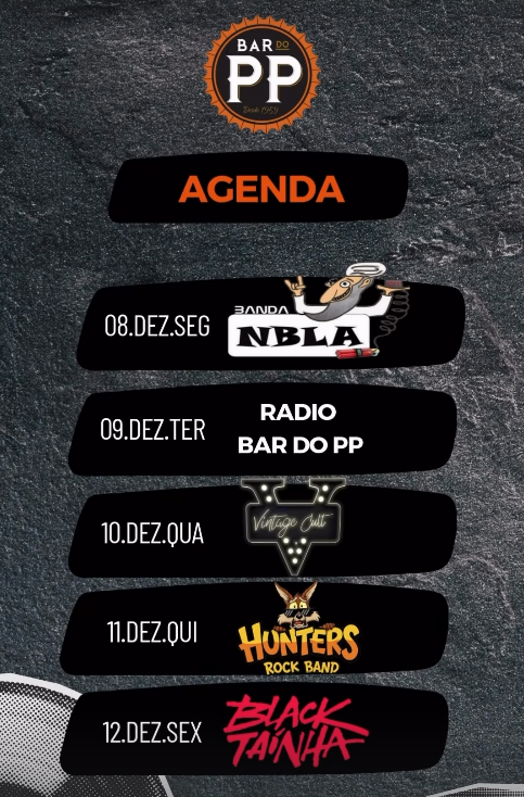 O Bar do PP segue como referência em bar com música ao vivo em Balneário Camboriú, unindo clima de pub, churrasco, encontro entre amigos e um palco sempre ocupado por bandas excelentes. Nesta semana de 8 a 12 de dezembro, a casa recebe NBLA, Rádio Bar do PP e três shows que passeiam por diferentes vertentes do rock, garantindo noites intensas e cheias de personalidade.
