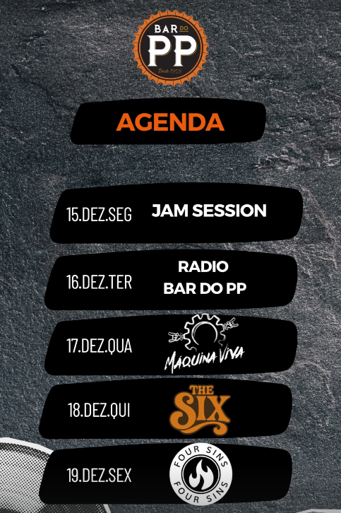 O Bar do PP segue firmando seu espaço como bar de rock em Balneário Camboriú, com clima de pub, encontros entre amigos e uma agenda semanal dedicada à música ao vivo. De 15 a 19 de dezembro, a casa traz Jam Session, o programa autoral Rádio Bar do PP e três bandas com pegada clássica e autoral, perfeitas para quem quer curtir diferentes vertentes do rock na reta final do ano.