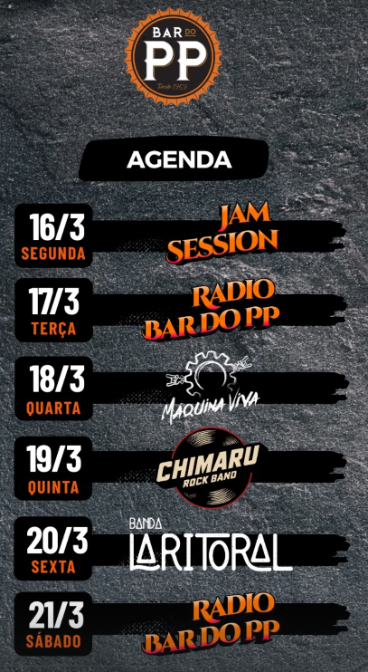 O Bar do PP segue com mais uma semana dedicada à música ao vivo em Balneário Camboriú, mantendo o clima de pub, encontros entre amigos e uma agenda voltada ao rock. De 16 a 21/03, a casa recebe Jam Session, Rádio Bar do PP e três atrações que passam pelo rock clássico, pop rock e repertórios cheios de energia.