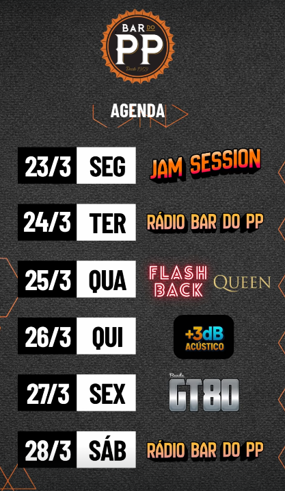 O Bar do PP mantém o ritmo de música ao vivo em Balneário Camboriú com uma semana que alterna entre conteúdos autoriais da casa e shows temáticos, reforçando sua proposta de pub roqueiro. De 23 a 28/03, a agenda traz Jam Session, Rádio Bar do PP, Flash Back Queen, +3dB Acústico e GT80, em noites para curtir entre amigos.