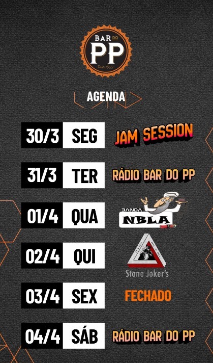 O Bar do PP abre a semana de transição entre março e abril com uma agenda que mantém o foco na música ao vivo em Balneário Camboriú, combinando formatos autoriais da casa com shows de bandas regionais. De 30/03 a 04/04, a programação inclui Jam Session, Rádio Bar do PP, NBLA, Stone Joker’s e uma noite fechada para o feriado, fechando com mais Rádio no sábado.