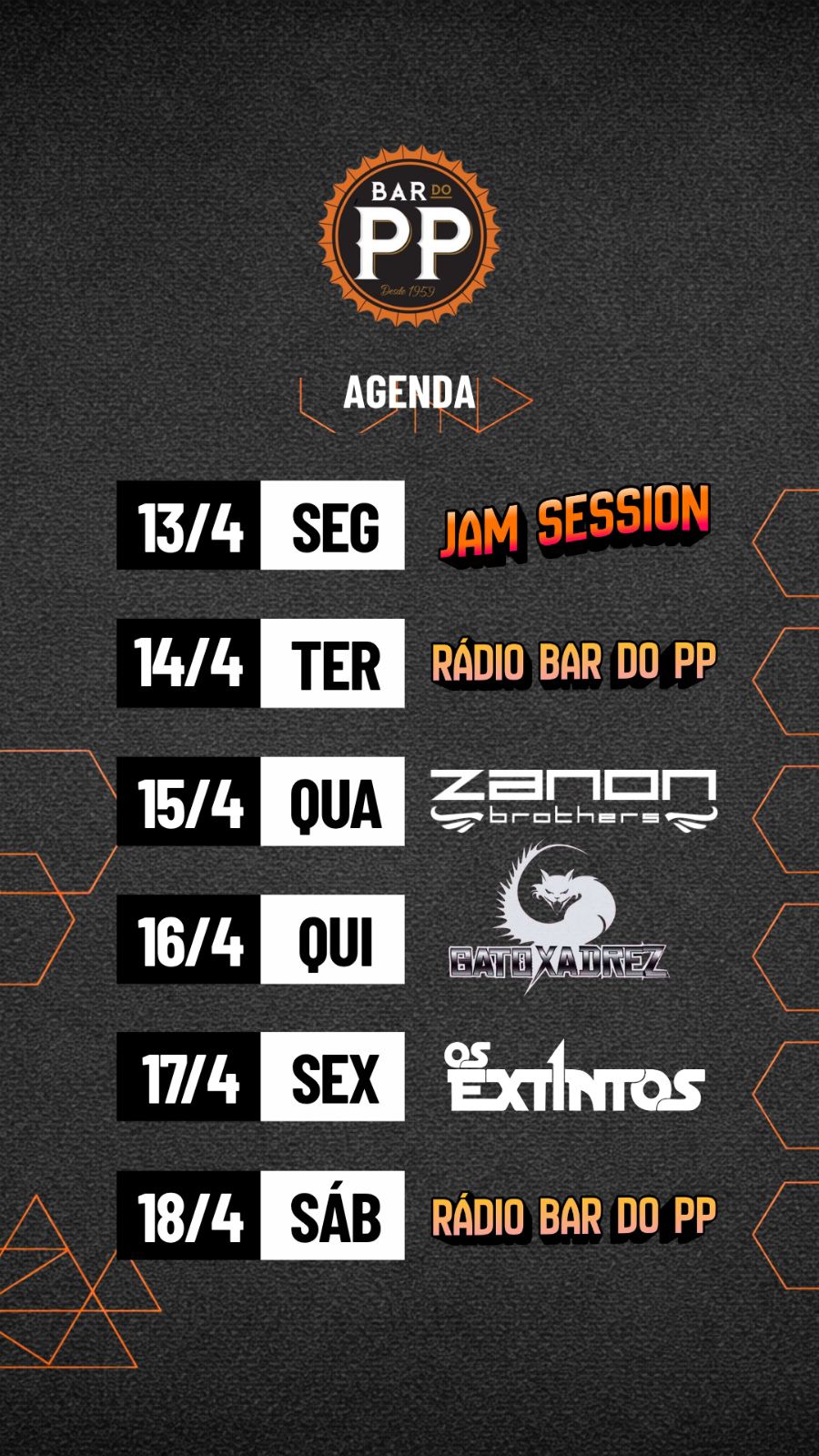 O Bar do PP abre mais uma semana com programação variada e palco aquecido em Balneário Camboriú. De 13 a 17/04, a agenda traz Jam Session, Zanon Brothers, Gato Xadrez, Os Extintos e encerra com o Rádio Bar do PP no sábado.